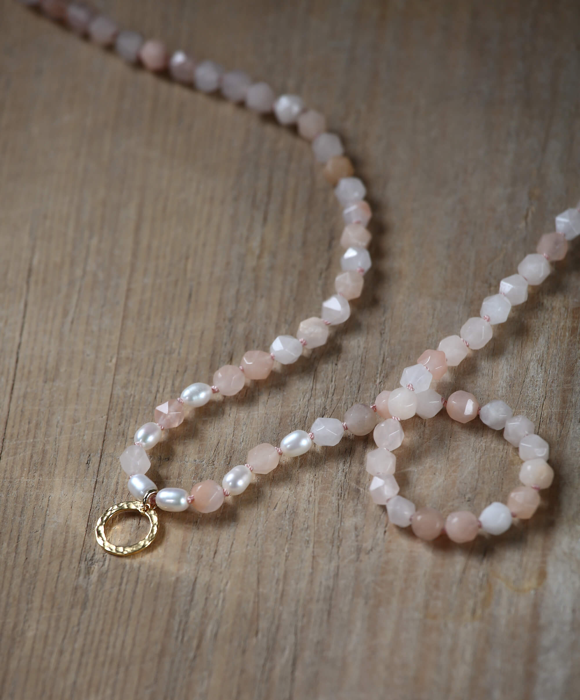 Rosa Aventurin stärkt das Herzchakra, unterstützt deine positive Lebenseinstellung und schenkt dir tiefes Vertrauen in dich und deinen Weg. Anstelle einer klassischen Guru-Perle trägt Santosha Mala einen handgefertigten, 24 Karat vergoldeten Ring. In seiner Oberfläche sind die feinen Spuren des Schmiedens sichtbar und machen jedes Stück einzigartig. Dein „Guru-Ring“ ist ein Zeichen, dass alles in Bewegung ist – in jeder Furche kannst du die schöpferische Energie spüren, die auch in dir steckt. Sie steht dir bei großen Veränderungen bei, aber hilft dir auch über die kleinen Hürden des Alltags. Schließlich heißt Santosha übersetzt: Zufriedenheit:)
